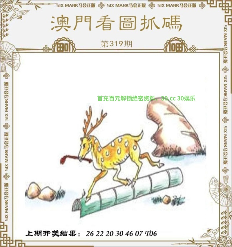 | 319期:【解抓码图】【开鸡45】 破解图文:图中有一只鹿有着黄色的皮毛,上面点缀着白色的斑点,头上长着鹿角,它口中衔着一根手杖或木棍,前蹄和后蹄正跨过一根横放的圆木。 综合九肖:羊马蛇虎牛猪兔鸡狗 |